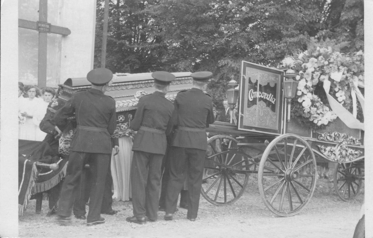 Hasiči vynášejí rakev z kostela